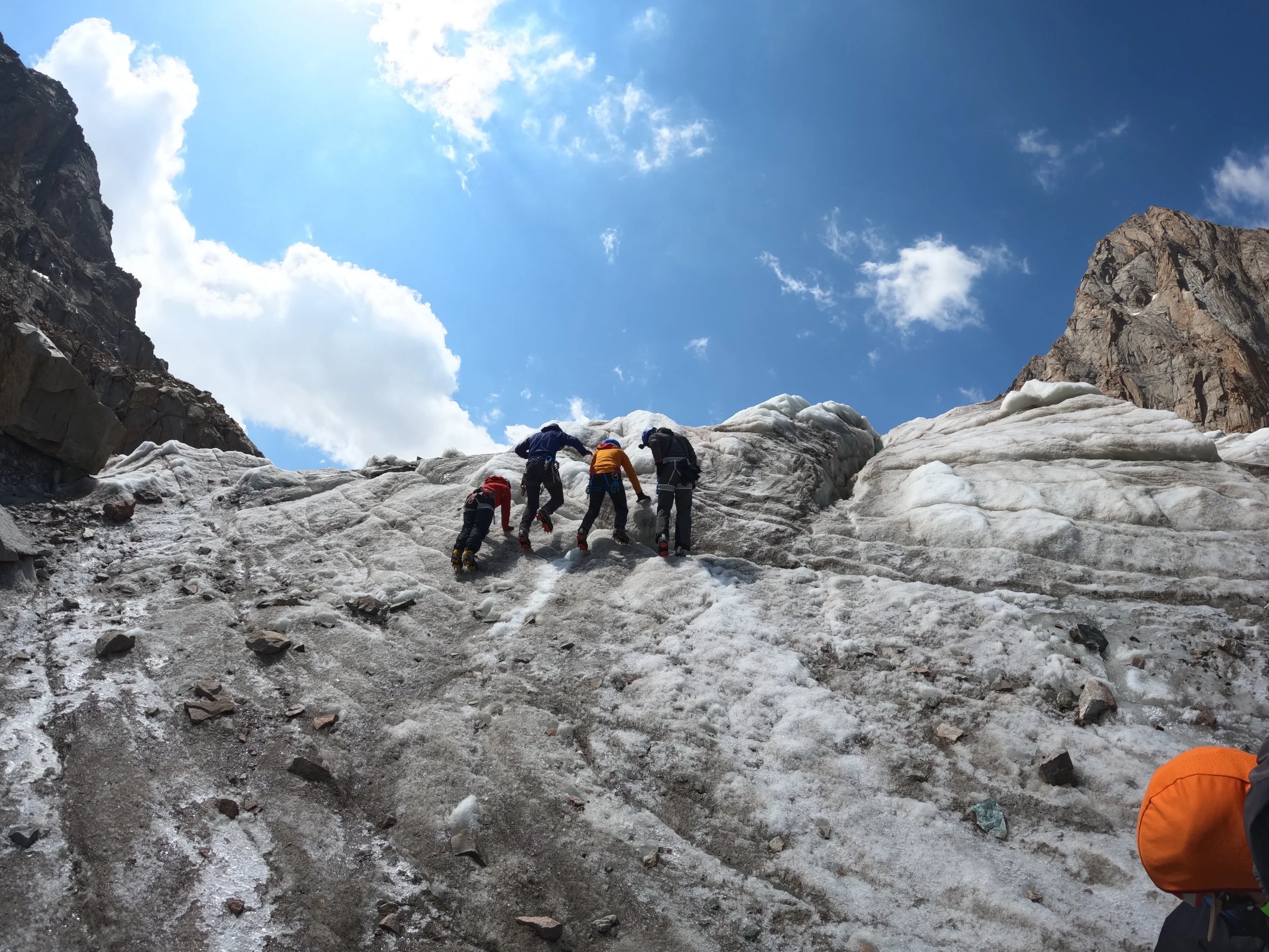 Learn mountaineering skills on the Ak-Sai glacier under the expert tuition of local IFMGA guides based at Ratzek hut in Ala-archa National Park. These mountaineering sessions will be run in small groups (1:3 guide to participant ratio) and include glacier crossing, crevasse rescues and ice climbing. The mountaineering course will include a guided summit on the final day, either a trekking route to Peak Uchitel (4540m) or another more technical peak.